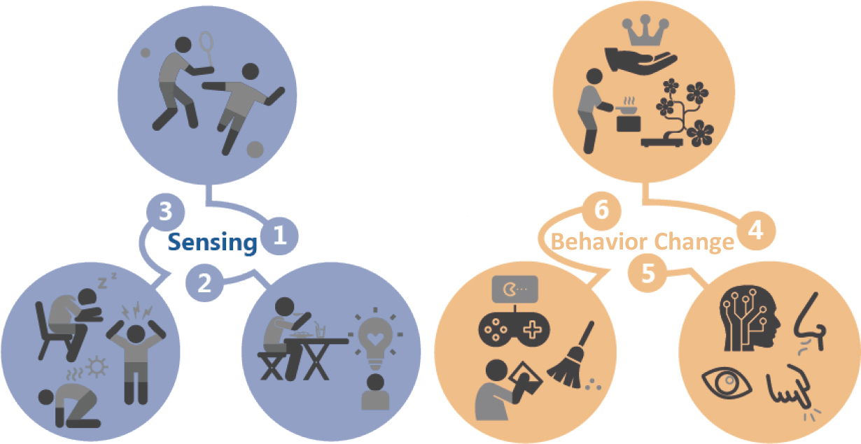 研究内容を簡単に紹介すると、主に活動と状態センシング班と行動変容フィードバック班で分けている。センシング班では、人間の生体情報から心身(行動、感情など)の状態を推定し、状態改善のためのフィードバックシステムの開発を目指している。フィードバック班では小型・ウェアラブルデバイスを新に作ったり、改良したりして、日常生活(家事など)および、習い事(芸道など)をより楽しく、より上手になれるようなインタラクションシステムを開発している。